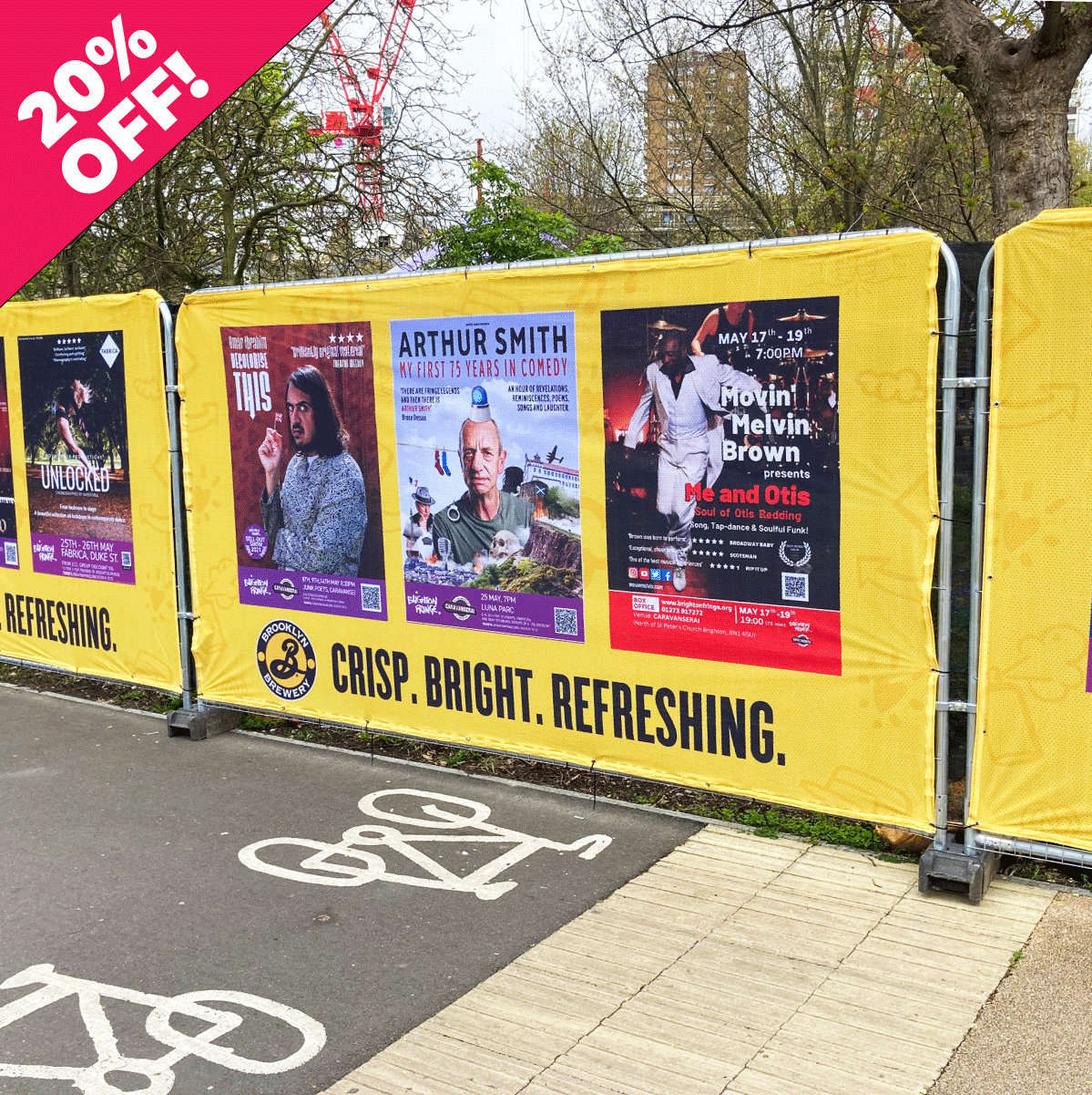 We have a large variety of printed display solutions for indoor and outdoor branding, to compliment your heras fence banners. Take a look at our popular mesh crowd barrier jackets, these are perfect for outdoor festivals and sports events, as well as indoor exhibition way finding, this helps people keep safe and informed at your event.